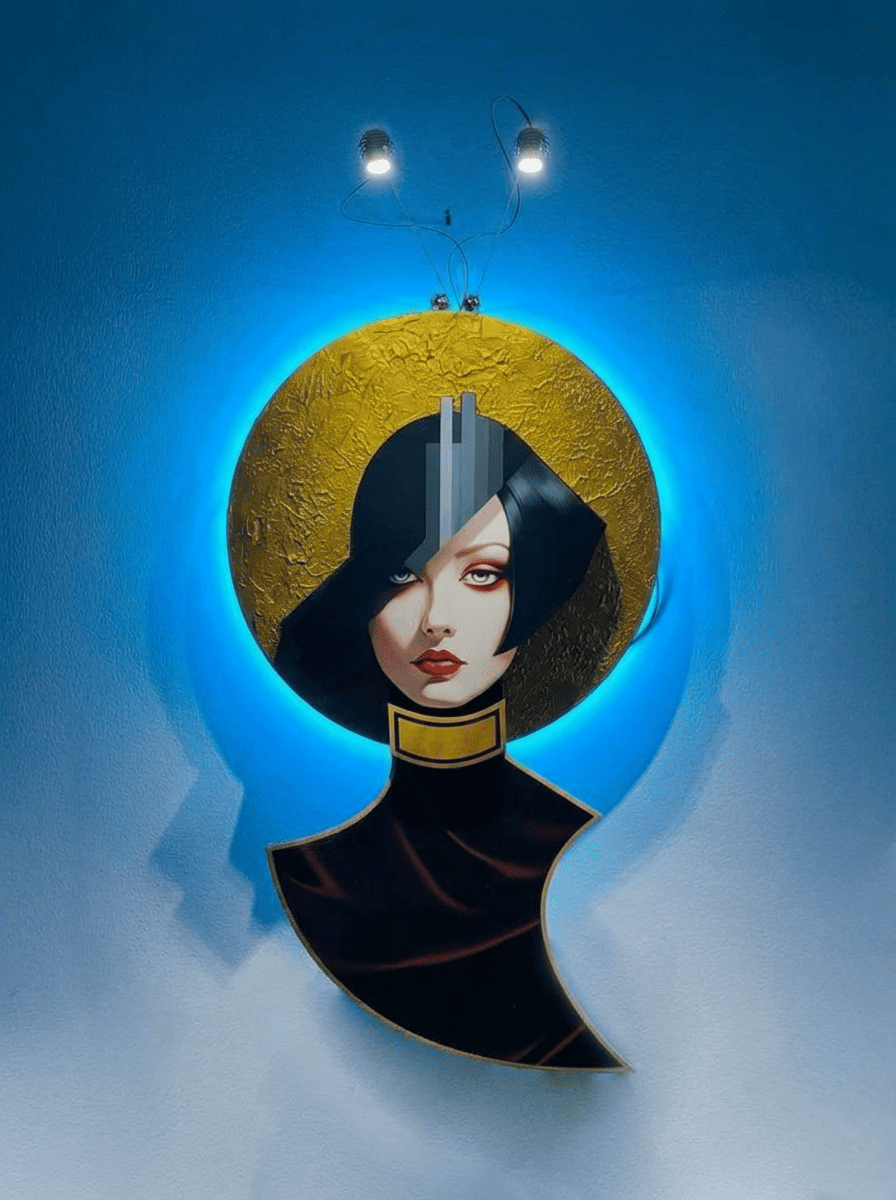 Opera luminosa con dettagli fatti a mano, ZYRA unisce arte e tecnologia.