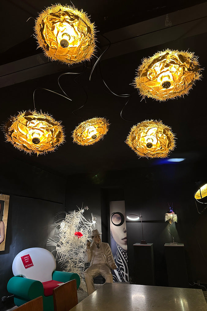 Particolarità: Steli modellabiliLampadina: A goccia LED da 7,5W 220V con cupolina in oroDischi in resina stroppicciata, verniciati a mano in oro